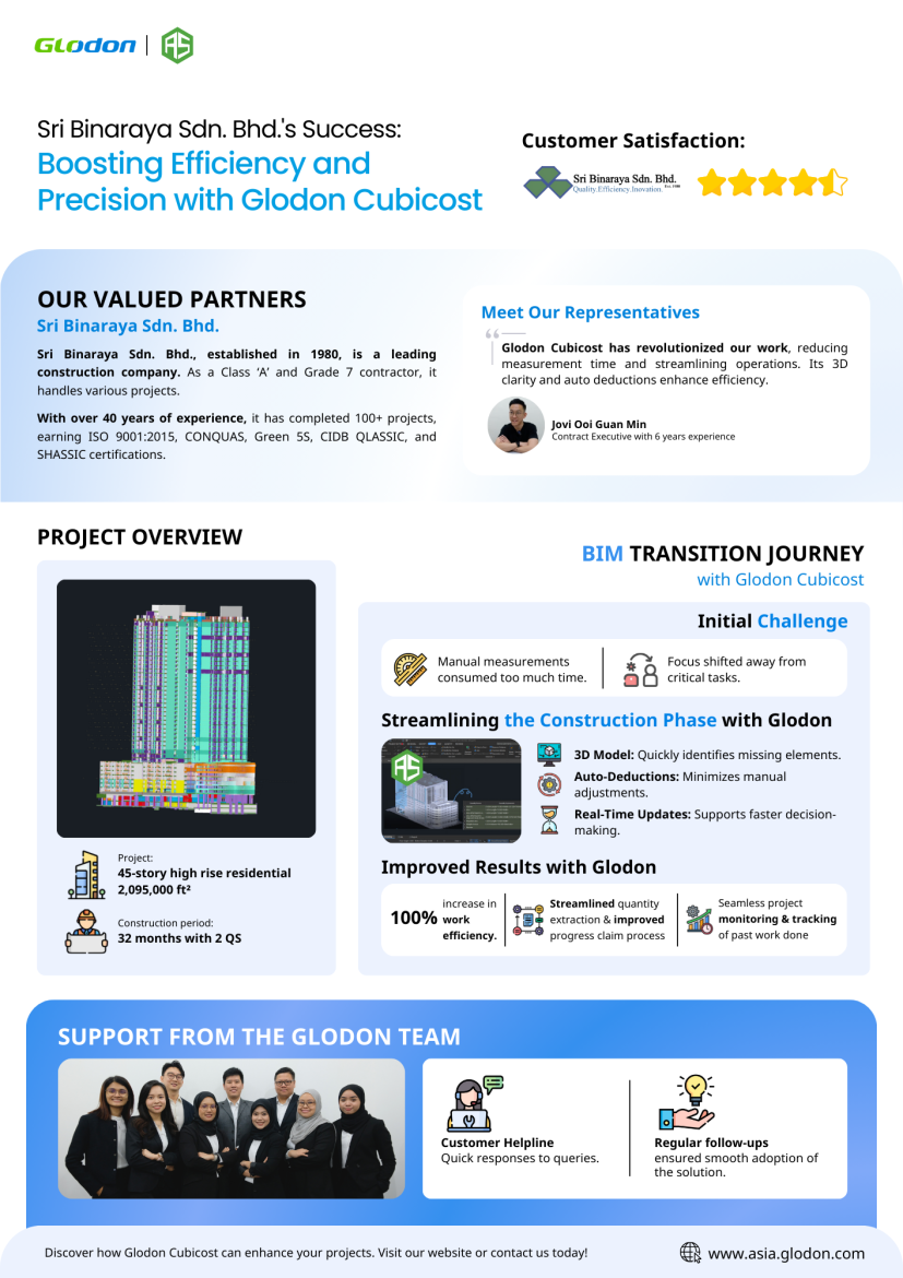 In the dynamic world of construction, innovation is no longer an option—it’s a necessity. Sri Binaraya Sdn. Bhd., a renowned Malaysian contractor, recognized this early on when they decided to adopt Glodon Cubicost into their operations. As one of the most advanced quantity takeoff software solutions available today, Cubicost has helped them shift from traditional, manual methods to a fully digital BIM 5D workflow. The result? Improved accuracy, increased efficiency, and faster project turnaround times.